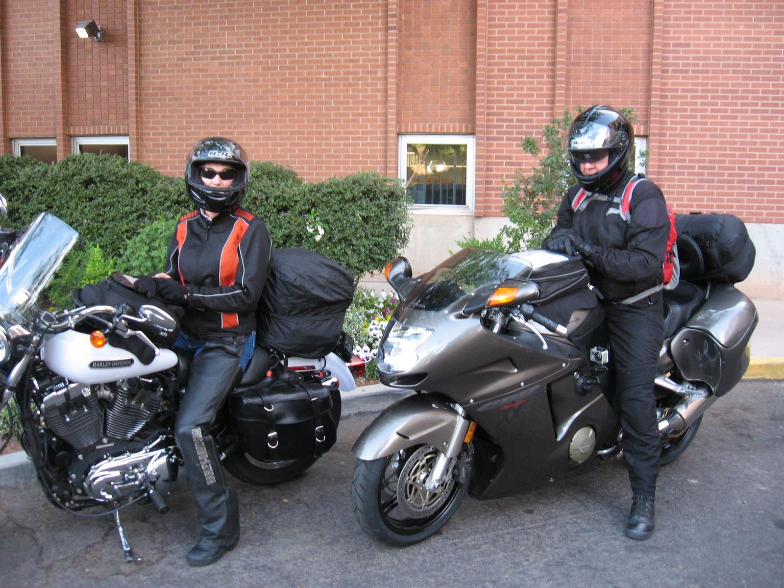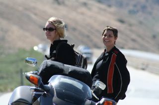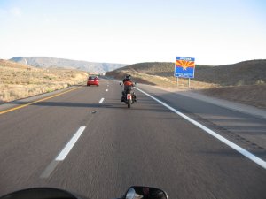 We drew comments at about every stop today. At McDonald’s in Bakersfield another patron asked about our trip (we’re pretty obvious in all the gear) and then talked about his yearly tour of the western states. In Barstow a little ol’ lady in an old red VW went on about her daughter (who was standing there filling the Bug) rides a Harley and how her son-in-law was wiped out by a semi in Laughlin last year – stories we never like to hear. In Vegas, “Didn’t I see you ladies northbound I-15?” He quit talking when I showed up.