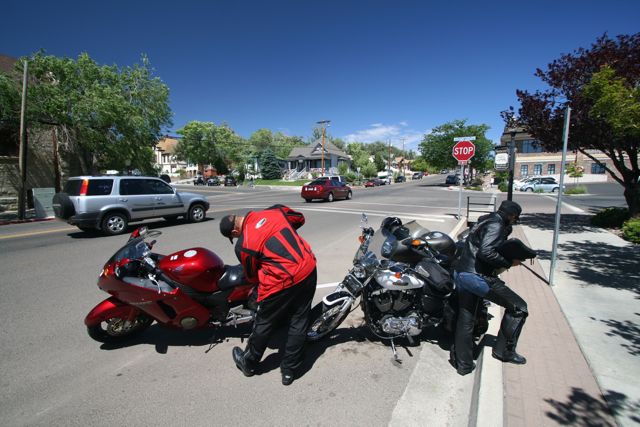 Before we hooked up we ran into a group of riders at a nearby Starbucks, hardcore canyon carvers for the most part on their way to the Devil’s Highway. We stood and talked and gawked at the machines, one of which was a Suzuki Hyabusa, the flagship of the marque and the nemesis to the Blackbird. There were three guys waiting when we pulled up, one clad in red mesh who rode a Yamaha R1, and two others – a young guy in full armor and an old guy in reinforced jeans. And I mean old guy in the best of terms, very affable and easy to talk to, pushing 60. I noticed the ‘Busa had a Throttlemeister installed like I had on the ‘Bird so I asked the kid in the armor how he had the set-up.