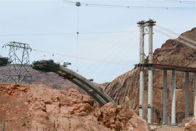 One sixty seven turns into 166 that intersects Highway 93, another major construction project, really, really big. A bridge is being constructed to accommodate 93’s new split two-lanes that spans the width of the Colorado River Gorge known as the Hoover Dam Bypass.