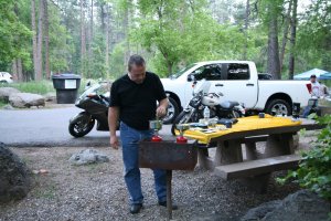 Sedona comes along none too soon as we’re tired and thirsty and ready to make camp. The place was jammed with early-season tourists who thought it wouldn’t be, us included. After grocery getting we continued up Oak Creek Canyon, coming across on full campground after another. At the last stop before 89A hikes out of the canyon we found a great spot next to the river. Chase went on his way, and we pitched camp and cooked up packaged chicken over rice.