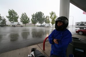 Pragmatic neopreaned wrist, ankle bands and collars, highwaisted pants and draw string tops kept us dry while we rolled down 89 to Kanab. We stopped at the last gas station east of town to top off when the sky fell.