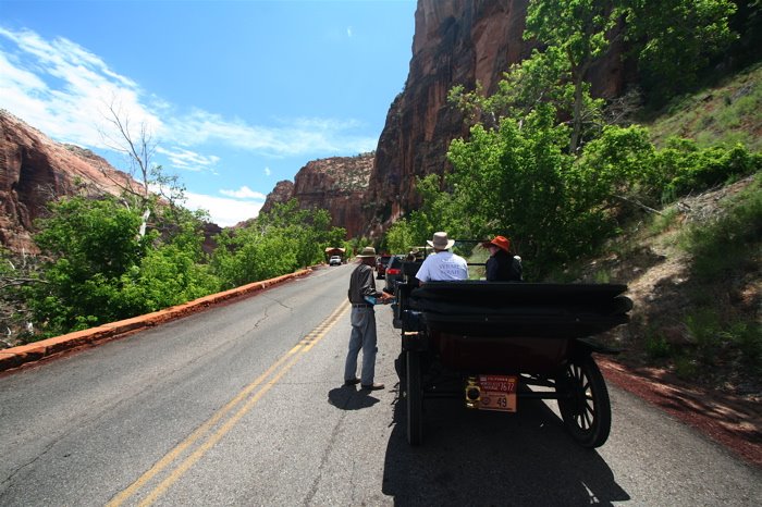 Any trip east for us begins through the portal of Zion National Park, setting a high mark for the rest of the journey. We got a later-than-usual start on Friday (June 26) putting us on the switch-backs of the Zion tunnel after high noon. Summer traffic lumbers up and down this spectacular road, usually with oversized RV’s and unfamiliar drivers of American rental cars. On this day, though, the arteries were clogged by a sweeter fare, a gathering of Model T Fords.