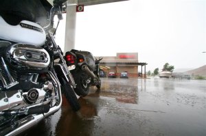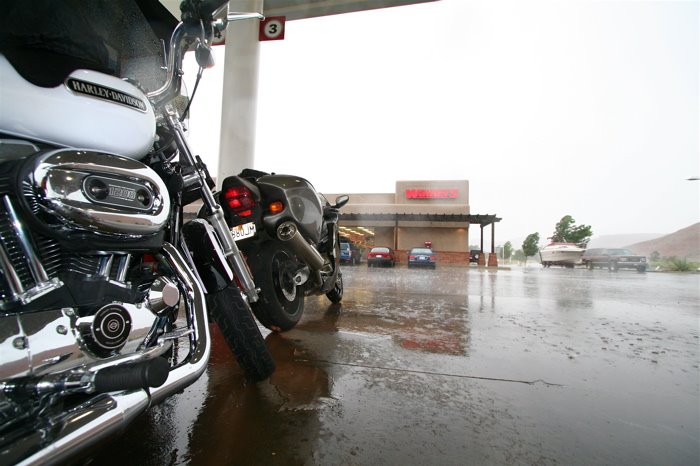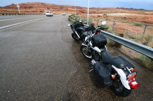 We kid about getting our annual rainfall in an afternoon. Monsoons in this area roll in quickly and dump a lot of water only to be evaporated a few moments later. But this one was slower moving, filling anything convex with water. We left our rides at the pumps and waited out the down poor inside the convenience store. It let up, we geared up and mounted, heading west to Page, AZ.