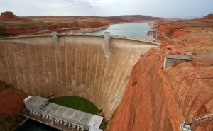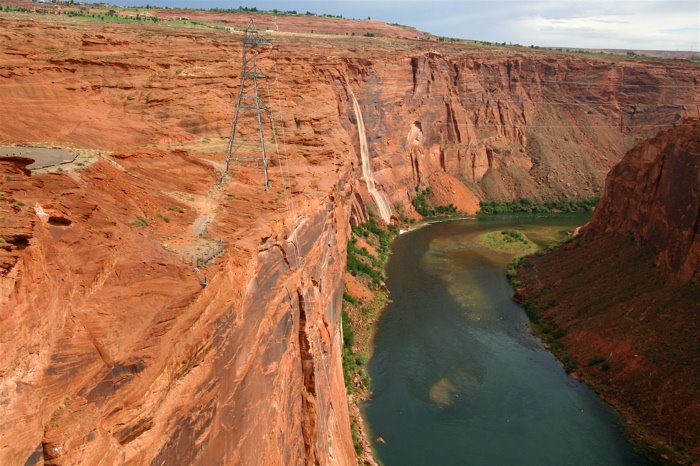 At Page we reached the dam, grateful for a break of sunshine wedging through and highlighting the shore at Wahweap. As we crossed the Glen Canyon dam we saw plumes of runoff plunging into the Colorado. That was a lot of water.