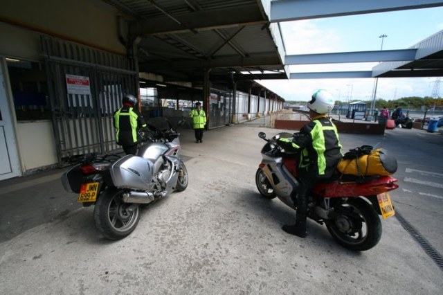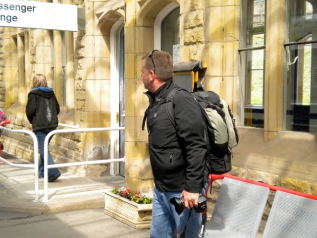 While waiting for our train I chatted with a couple of more motorcyclists, these two returning from a ride around GB on their sport tourers, the closest I had yet seen to a Blackbird. They were catching the ferry back to IoM where they live – truly motorcycle Mecca. What set these guys apart, for me at least, it that they were in their 70’s. Gave me something to shoot for. They’re seen here at the entrance to the ferry staging area and just beyond them is the rail spur.