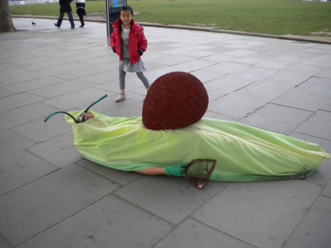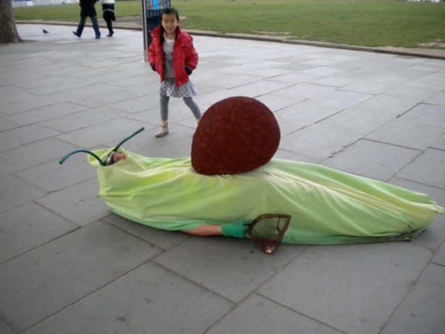 Having unlocked the code of London’s above-ground transit system we were off to explore London, at least its more notable quartiers during such a time where the Parliament was without a Speaker of the House. We hopped a double-decker and made our way to the National Theatre off of Waterloo Road, collecting it seemed at least a half-dozen bicyclists on the front of the bus along the way. From there we walked along the Thames past the Queen Elizabeth Hall where we and all others encountered this slug.