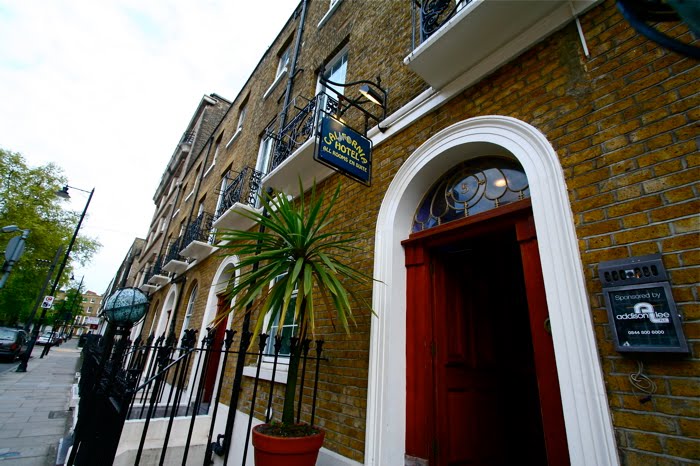 Across from St. Pancras and King’s Cross stations is a hotel district of East London, rows of stately properties, shingles displaying vacancies or no. We came across one in particular that begged any fan of the Eagles to at least check out the rates, the Hotel California.