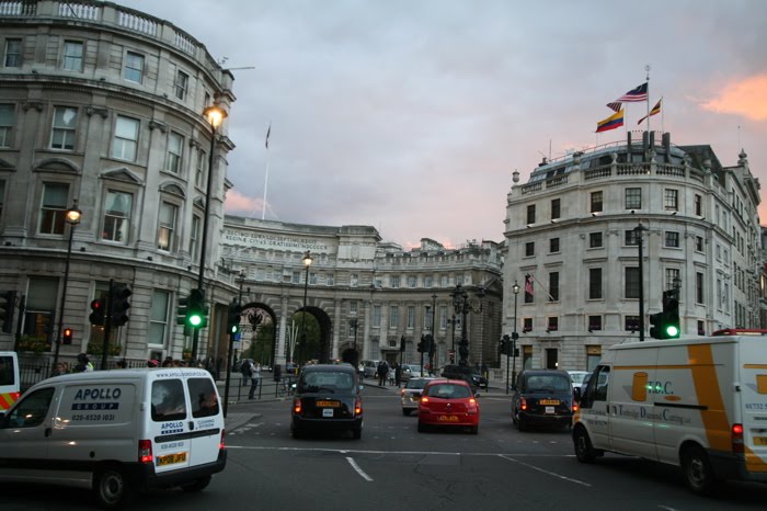 Traffic moves at a pace in London that makes most American urban centers look like parking lots. Well, actually, most of them are. It’s a tribute to Londoners that traffic is moving at all, especially to bus drivers. As we stepped into the Circus a young woman was bumped off her bicycle by a car. She fell down hard enough for contusions and bruises, but was otherwise able to shake it off. While helping her to her feet, traffic pressed on around us like platelets around plaque. One bus driver gently persuaded a woman gawker to move along with his rear-view mirror.