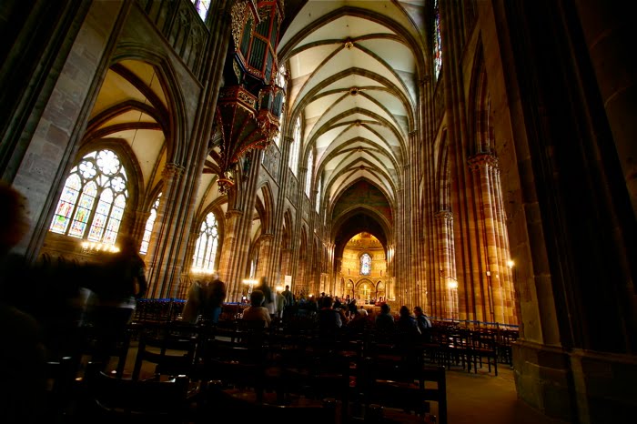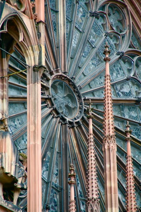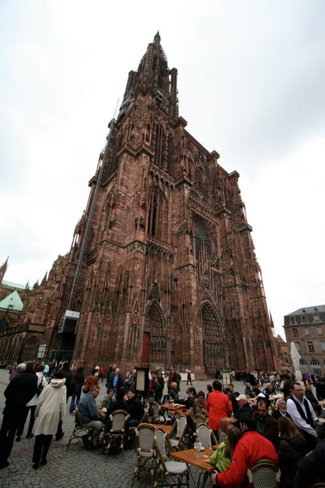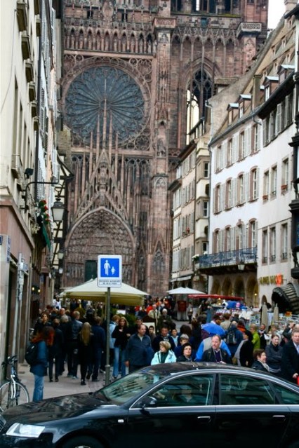 We followed other pedestrians and signs to Rue Merciere that leads right to the place of Our Lady, the Cathedral Notre-Dame de Strasbourg. Look down the rue and it rests there like the eye of Moby Dick at the gunwale, only bigger and with scaffolding.