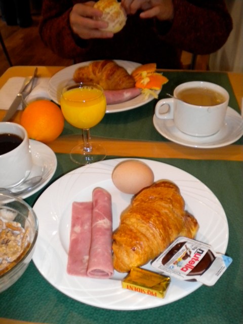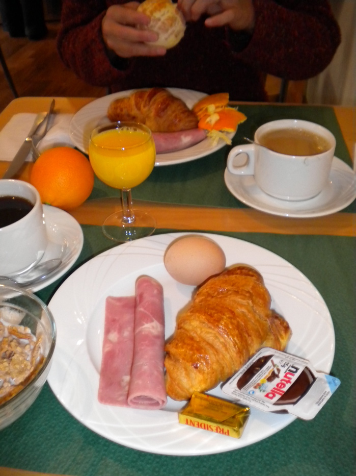 The morning next we had breakfast at the hotel, a petit dejeuner of a hard-boiled egg, a croissant, ham and juice and coffee.