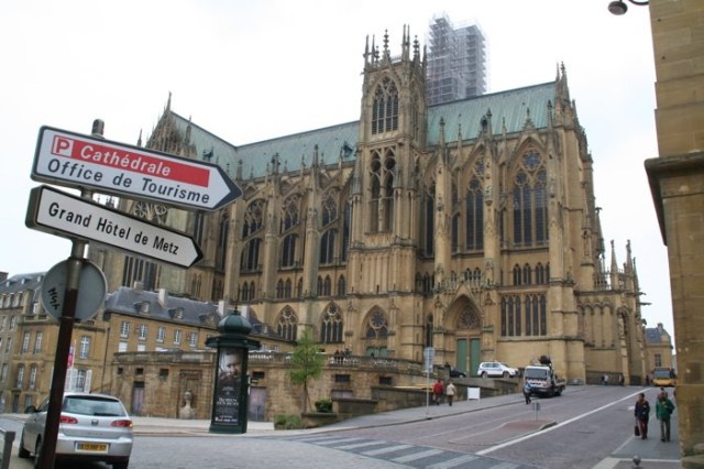 We descended down Quai du Temple Neuf and turned east into the city following signs to the Cathedral Saint-Etienne de Metz, an edifice grand enough to swallow Temple Neuf and still allow a kayaking competition to happen inside it.