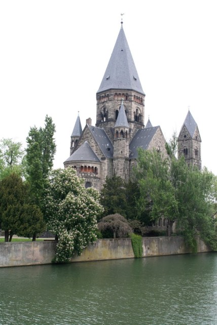 We continued along Chemin du Halage, the walkway along the river bank to Pont Moyen that provides a wonderful view of Temple Neuf, a Protestant Cathedral that divides the Moselle once again.