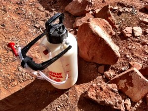 Mindy joined me and we made a hearty breakfast, accompanied by a floor show. The reason our rowdy rangers got up so early was to take on the task of cleaning one of the campground’s two composting toilets. They dawned hazmat suits armed with shovels and heavy-duty garbage bags, and though they were about seventy yards away we could hear every word due to the parabolic nature of the cliff under which we camped.