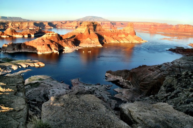 We got back on 300 to take us to Big Water when we noticed road 231 to Warm Creek Bay, a place we kayaked a year ago last May. The road follows the river bed of Warm Creek and about four miles in, if you’re paying attention you can see where lake levels have been in the past.