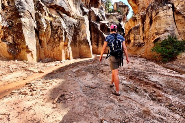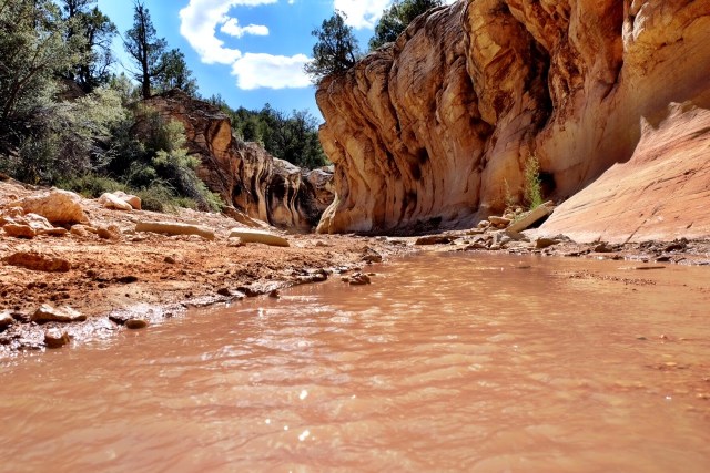A short jaunt slightly rises and then descends into the canyon where the creek flows with an abundance of light sediment.