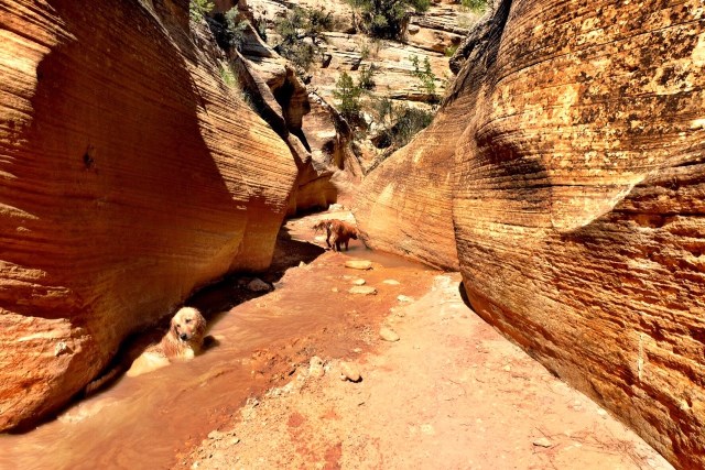 It was really more by accident that we came across the Willis Creek Trail. On Pioneer Day morning we were looking for dog-friendly day hikes close to Hurricane, something that would get us out of the hottest day of the year so far, with water for Ginger and Maryann. In her search, Mindy found a hiking trail, Willis Creek, near Kolob Reservoir. When she went back to search Willis Creek, a different spot came up, this one with the promise of slot canyons.