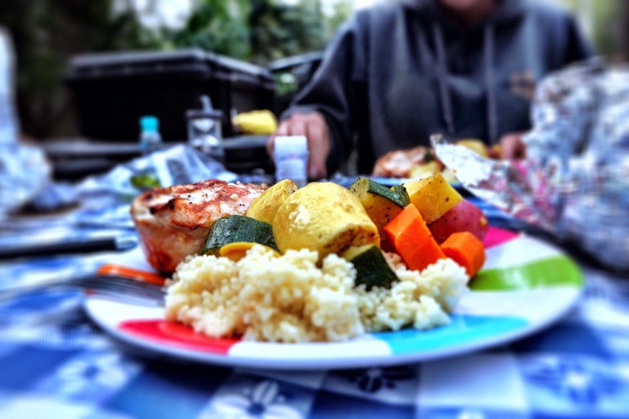 As the shadows grew longer I attempted a fire to create some coals for our foil-wrapped veggies, but the area fuel was too wet, so we cooked them on the Volcano along chicken breasts. Cous cous rounded out the fare of a delicious evening meal. By the way, if you’re not familiar with the Moroccan pasta, cous cous is a great camp meal starch in its ease of preparation and mild taste that blends wonderfully with herbs and fungi. Just don’t eat it raw and drink a lot of beer. The Belgians tortured Algerians this way.
