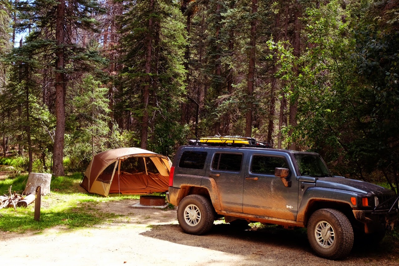 About half way through Hell’s Backbone we turned off the trail and headed up to the Blue Spruce Campground, seven sites, six of which are bordered by the clear Pine Creek. It was mid-afternoon, and the mossy green forest floor and the small falls of the creek bid us abandon of any further driving in favor of relaxing instead.