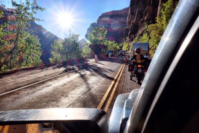 If you’ve never made the Utah Highway 9 traverse of the canyon, you should know that it is by no means a shortcut to Highway 89, but it is always well worth the time it takes. One of the slowing influences is the obligatory traffic control turning the two-way flow through the Zion tunnel into one-way whenever an RV over a certain size presents itself, much like the one above. The tunnel is a mile long and was engineered at a time when caravans this size were unimaginable, at least in making their way up to the tunnel to begin with.