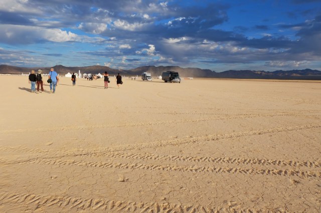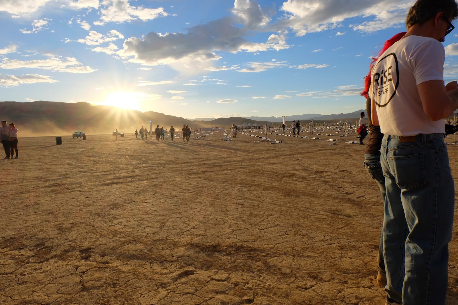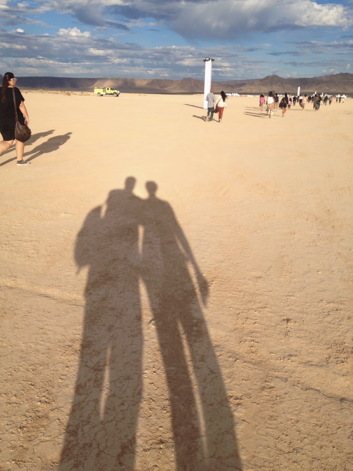 Following their email updates and instructions about the event brought us to this point of ambling along a cracked lake bed to a site that looked as if its participants were expecting light to come down out of space rather than for it to go up to the heavens.