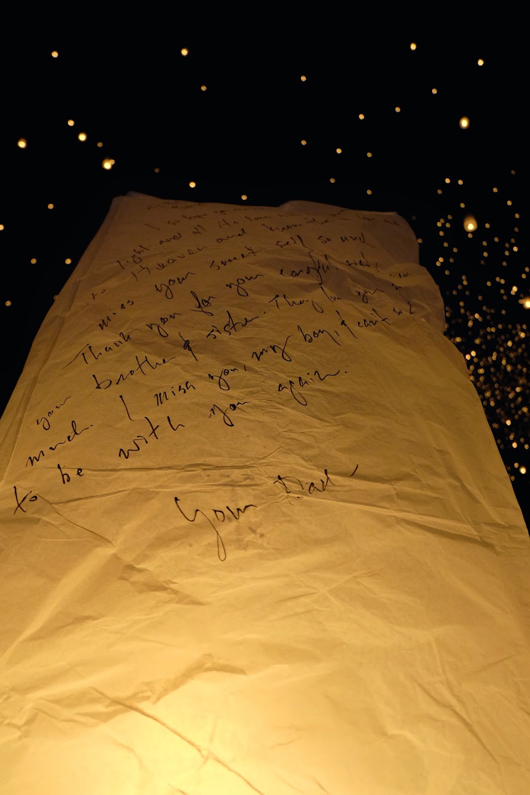 Photos here or anywhere do not do this justice and video is a vain attempt at the same because any vicarious effort to understand the impact of watching light take flight cannot be captured outside of it saturating one’s own optic nerves and sinking deep into the heart. The reason for this is consciousness. Every lantern has its purpose; goodwill, a message to assuage, an expression of love, a release of burdens, a memorial, or a note to a deceased loved one.