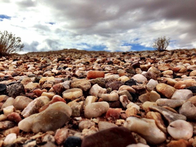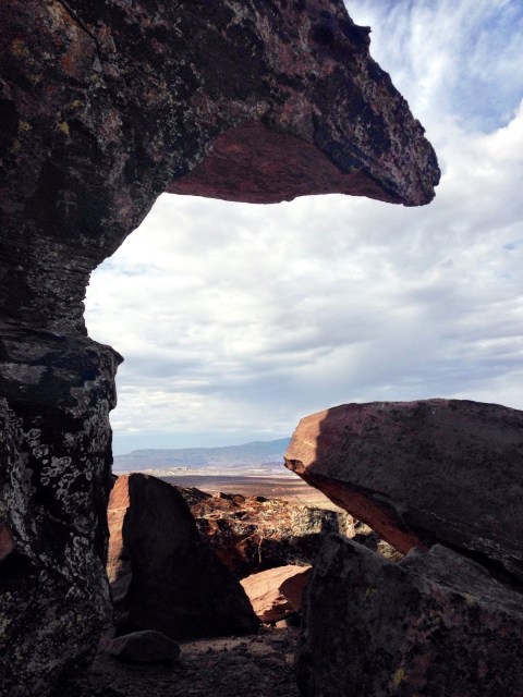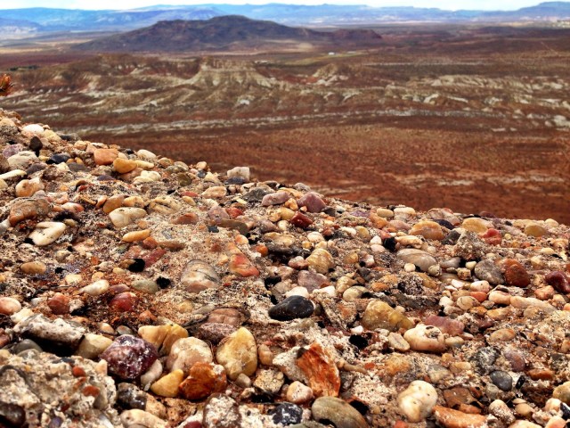 An aggregate of polished rocks fused in sand as hard a cement. I’m no geologist, but it’s clear a river used to run through here. What’s cool about this, is that “here” is about eight hundred feet above the valley floor below.