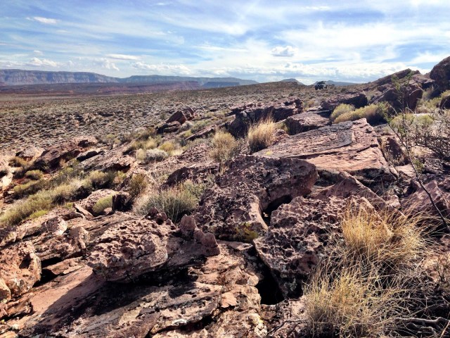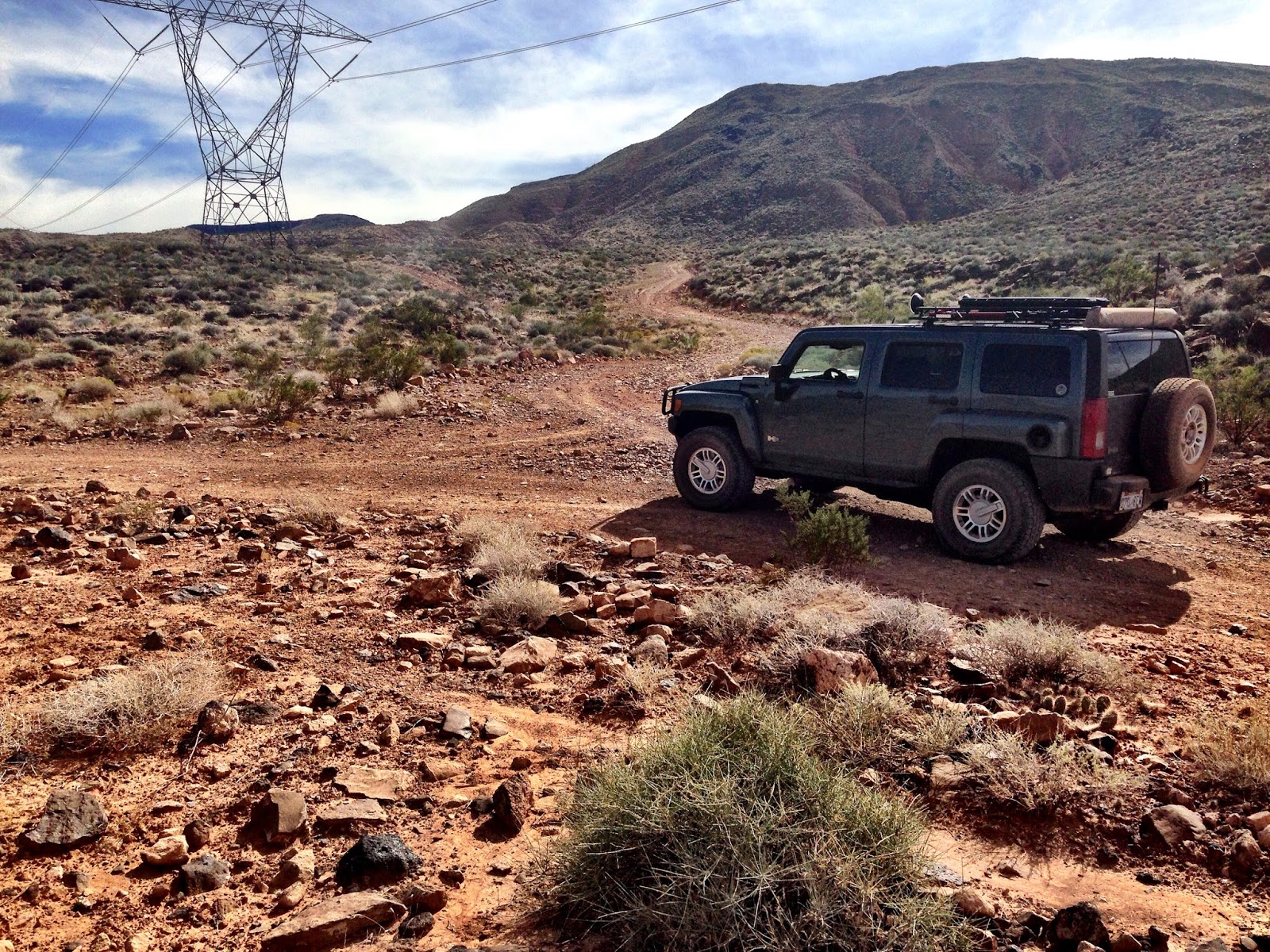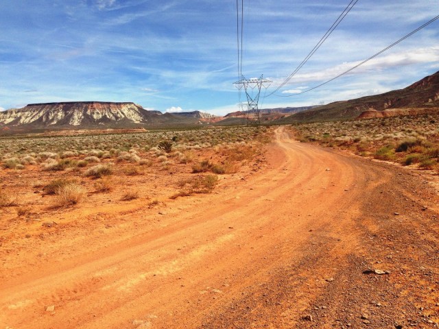 BLM 1035 doubles as a service road for the transmission lines and towers and winds through their span until you hit the Colorado Plateau. On most of its ascents, the road is littered with large rocks and loose shale. It’s important to pick a good line, being mindful of sidewall exposure as well. These minerals can cut right through the letters.