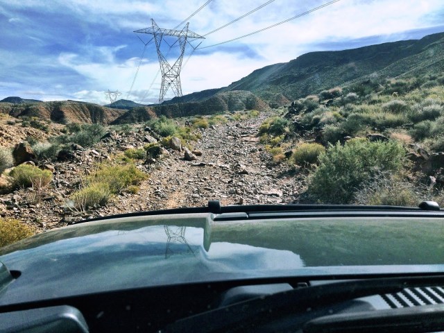 Remount the main road, (now BLM 1035), also known as the Sunshine Trail for mountain bikers, and head south until the road divides just under high tension power lines.
