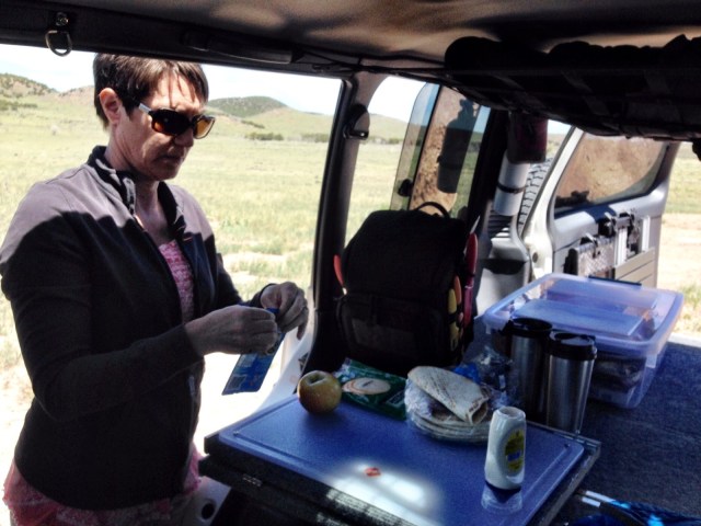 Scrambled eggs and turkey bacon on pitas make for a good walking breakfast thanks to Mindy. We struck camp as the wind picked up and made our way on to Monument Valley.