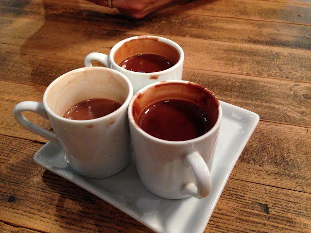 Drinkable chocolate. I know, but you just have to try it yourself to get it. I’d dare say it’s a milestone in my chocolate experience. It consisted of a flight (my new favorite word when it comes to beer, wine and now chocolate) of milk chocolate and cinnamon, a spicy dark chocolate and a third of which I can’t recall because I became fixated on the first. Religion should be this honest and soul piercing.