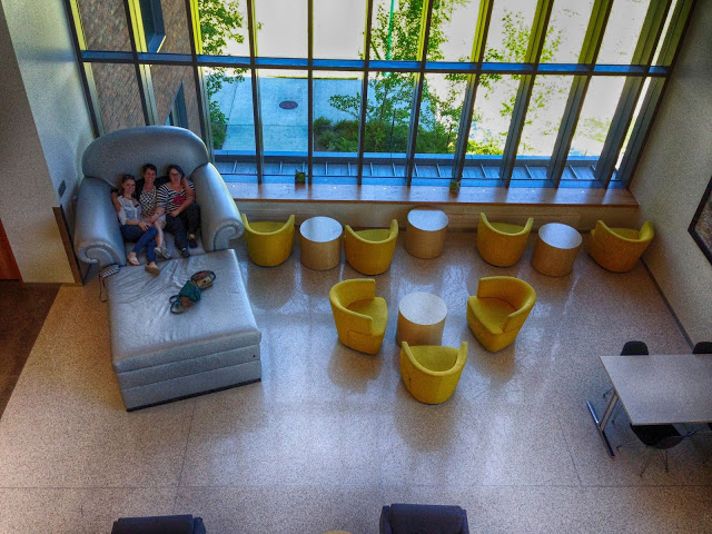 We managed to find what has now become an icon in my visual communication curriculum, the Duck’s over-sized chair and ottoman which used to be housed in the old student union. I was happy to see it’s been given new life with new upholstery in the new student union. Not quite as happy to see that those ugly yellow chairs were spared as well.
