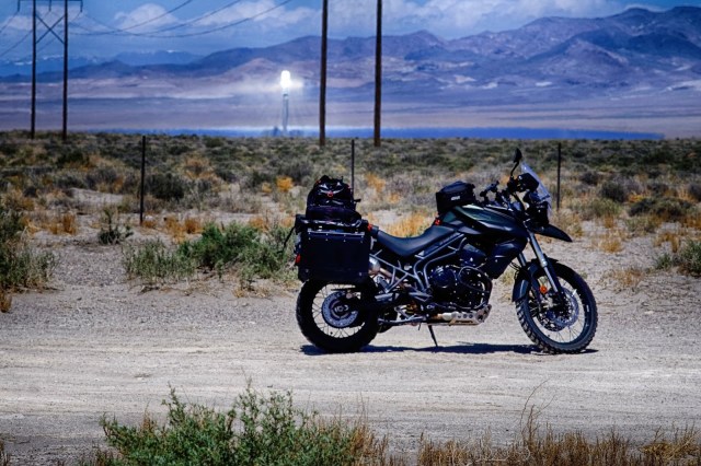 The wind here was the worst I’d ever experienced riding. Shortly after releasing the shutter on the above image I was engulfed in a sandstorm. There’s sand now accumulated in the twin headlight shrouds on the Tiger. From Tonopah I fought the wind along Highway 6 until the road turned north and the wind was at my back. I stayed the night in Ely.