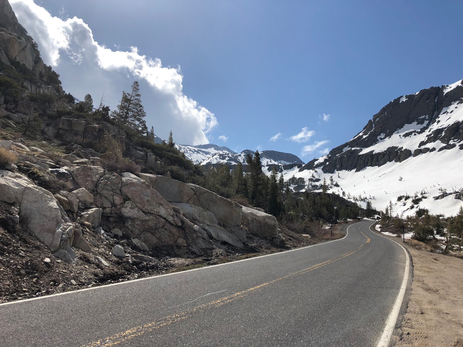 I hit some snow flurries at the summit and then the sun favored me for most of my ride on the leeward side of the Pass.