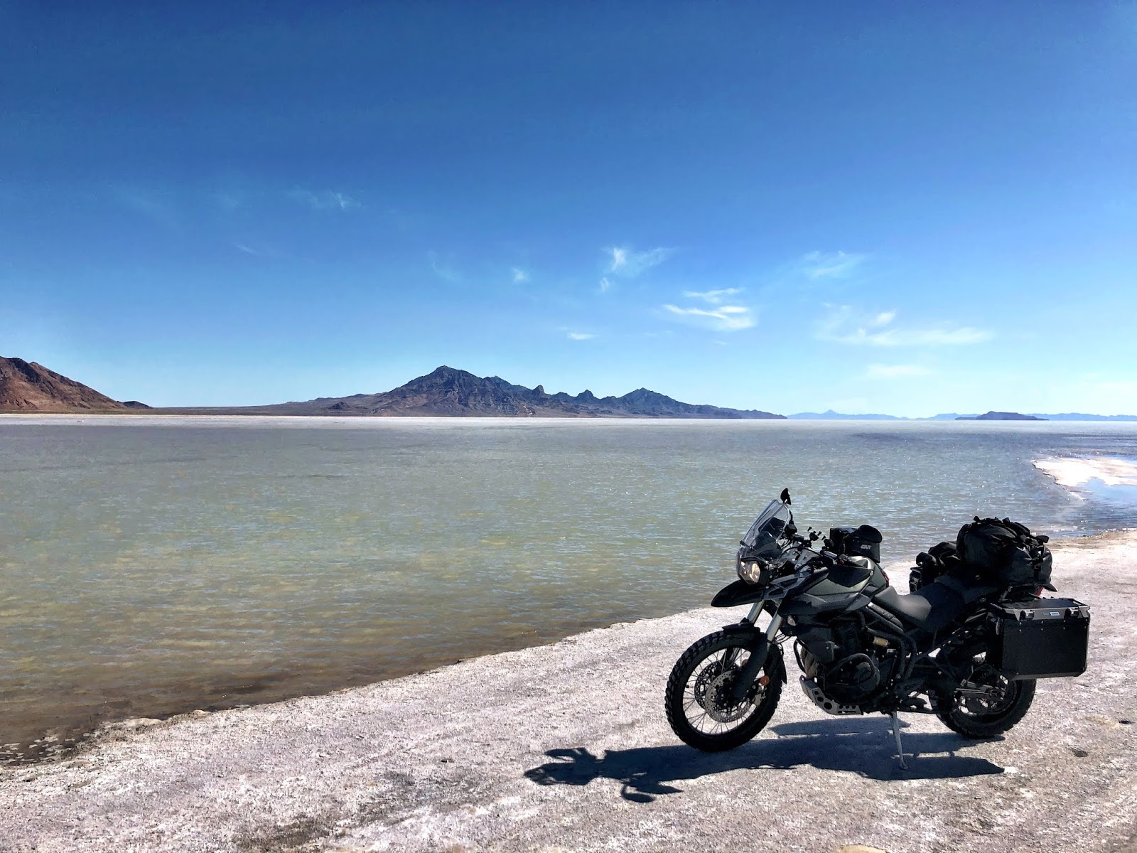 They’re a little soggy this time of year. Last time I was out here the salt surface was perfect while I filmed a world-record speed attempt for an electric vehicle. On this stop I lost my electric charging cable for my iPhone. It’s only six inches long and plugs into a 12V outlet I have installed on my handlebars. I looked all over for it but came up empty handed. I had a spare, longer cable in my bag, but had enough charge to get me back to Bountiful.