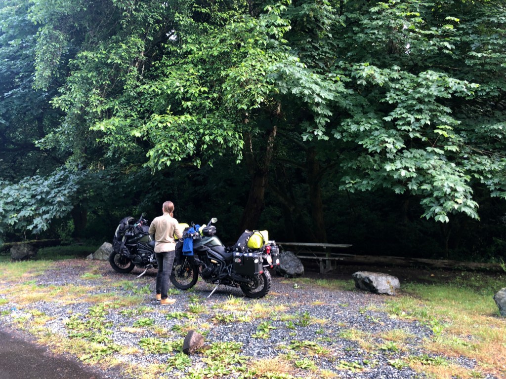 I can’t remember much about the morning’s stuff, breakfast, coffee, breaking down camp, packing up the bikes, probably due to the fog in my brain from the night’s disturbances. I remember we took another walk out to the sound to see if there was any indication of the commotion from the night before, but there was nothing. No body. So we went back to our site, suited up, fired up the Tigers and picked up on I-5 where we left off the afternoon before and went north skirting Seattle to I-90 East.