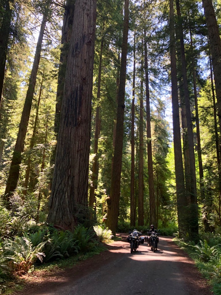 We took our heightened sense of vulnerable meatbags on death machines back out to the most dangerous motorcycle road in America. The Shoreline Highway took us through Fort Bragg and eventually inland to Leggett to join the 101, which apparently was too leisurely and safe for the Zumo, that decided to take us on a detour 106 miles out of our way starting at Gaberville taking us to incredible altitudes to Alderpoint where after the road deteriorated into something apocalyptic. Potholes as big as our bikes where there was asphalt. I kept looking for Wil Smith walking along with a German Shepherd. As I was getting more nervous by the mile I’d see Addie in my mirrors standing on her pegs letting the Tiger do its thing beneath her with that tall front wheel floating over obstacles and craters.