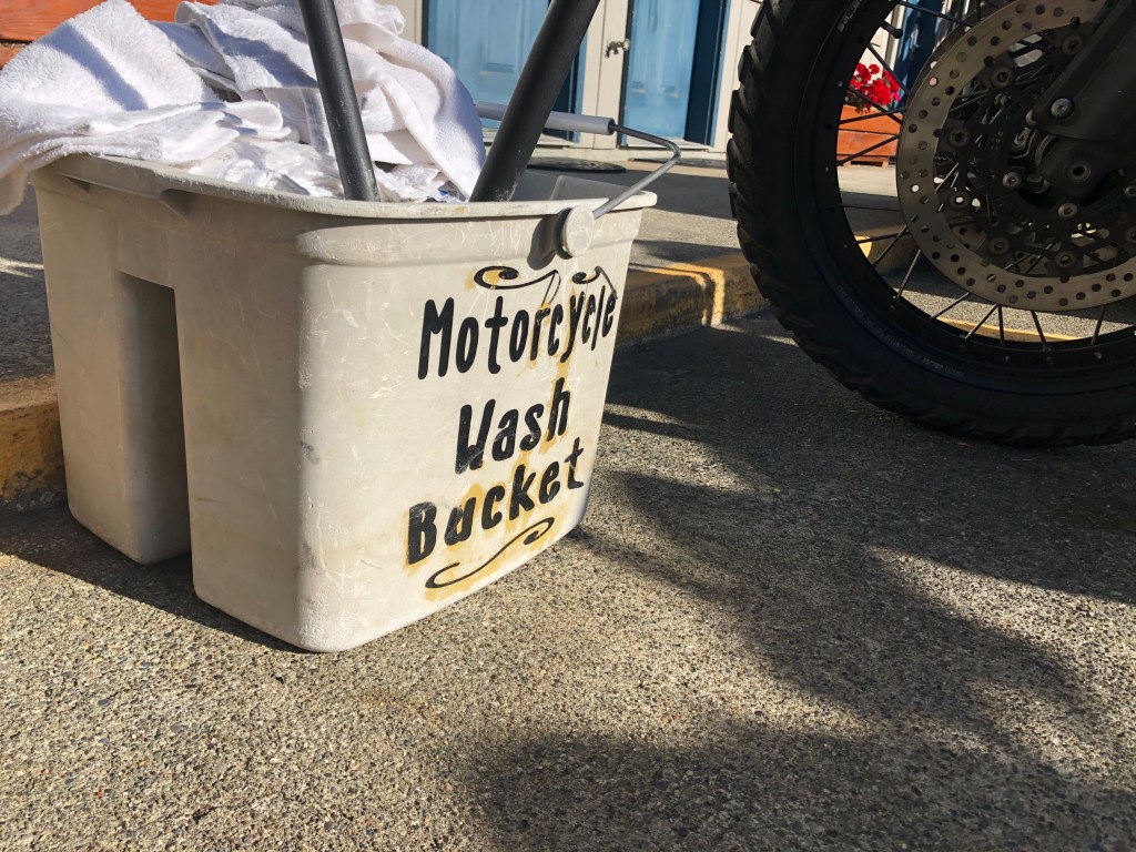 So, on the morning of our fourth day I left our tidy motel room to discover two things; the smell of fresh donuts being fried and a wash bucket with clean towels next to the bikes.