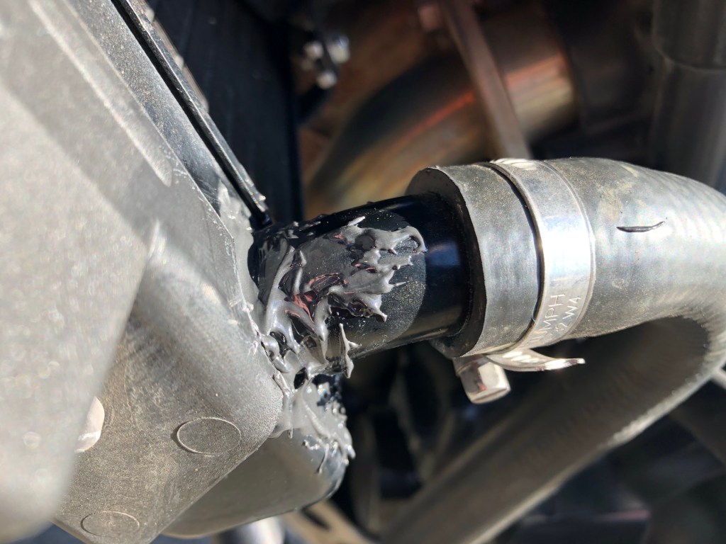 I got the shrouds off to expose the radiator and saw from the residue left behind by the coolant that the lower outlet to the radiator was leaking at the weld. The weld was broken, so what better fix than JB Kwik Weld? And I don’t even know how to weld. Addie does. All I had to do was mix a little goo from each tube and then apply it around the outlet at the base of the radiator.