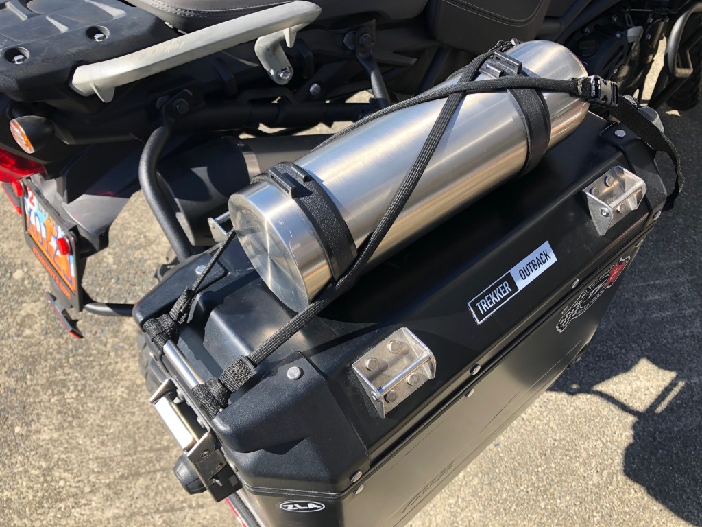 It’s not very pretty – function, not form. To hedge our bets, I found a large coffee thermos that converted into a vessel to hold the hard-to-find coolant that to which Triumphs are particular.