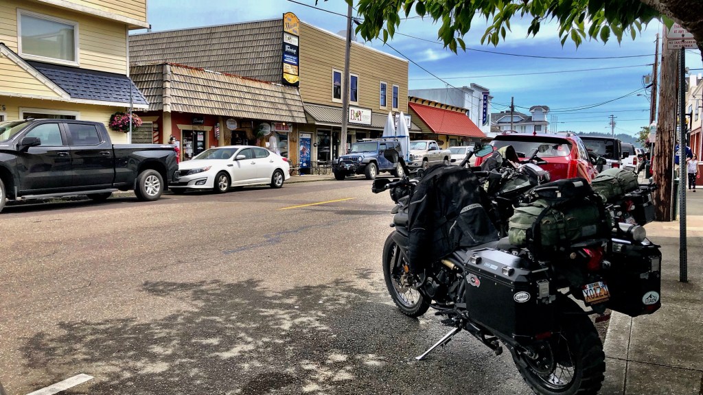 Another thing that keeps you in your place is coolant leaking out of a radiator fitting. We made our way to Bandon, Oregon in hopes of finding a spot to camp, though our search was in vain. When we stopped to consider options I noticed the fluid’s white residue on the engine guard and cover of Addie’s Tiger. This would change things up a bit for us, so we decided to find a motel instead where we could better think things through.