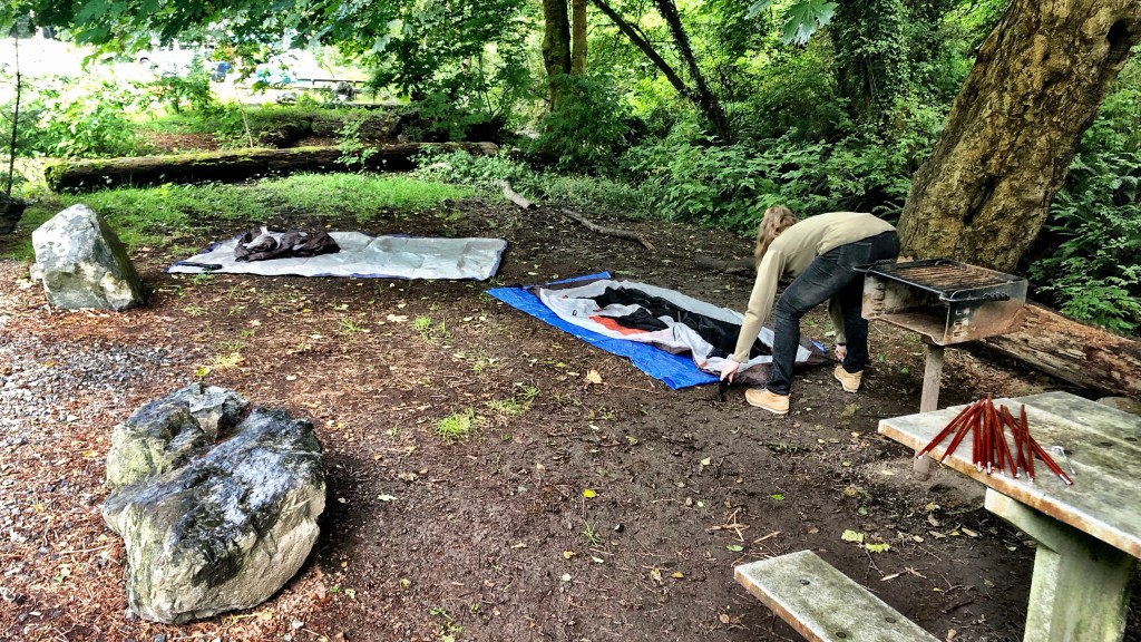 Once we lit at our site the first thing we did was pull out the tents and their flys and draped them over the bikes to help dry them out a bit, at least as dry as anything can get along the Puget Sound on a cloudy day.