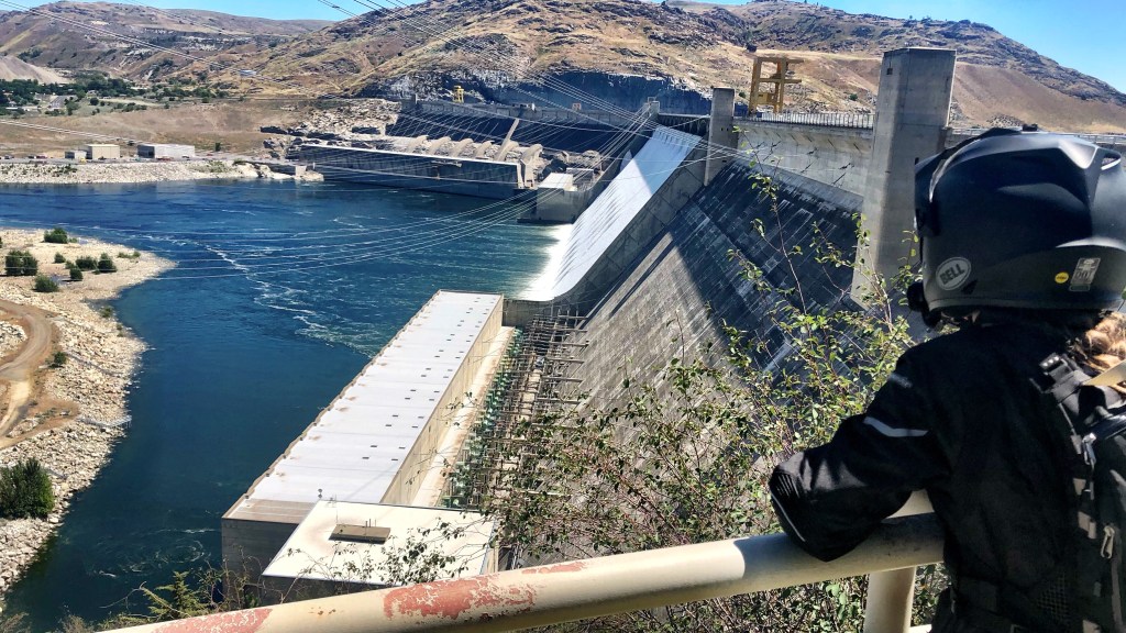 Over Osborn Bay, through Electric City and Grand Coulee and we arrived at the Grand Coulee Dam, an impressive hydro-electric facility spanning the Columbia’s northern flow.