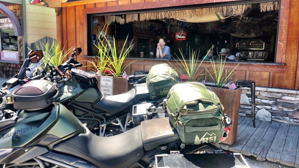 We were settled in, hitting the trip’s stride, its rhythm of movement and still, much different than traveling in a cage – how we on two wheels refer to four-wheel vehicles. Stop on a road trip in a car and you put it in park, take off your seat belt and get out, take a pic, maybe a stretch, get back in, buckle up, turn it over and off you go.