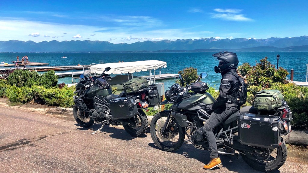What seemed like motorcycle euphoria the day before contrasted against this day’s 273 miles, one of our longer days, but it wasn’t the miles. Ninety through Shoshone and into Mineral County is a beautiful ride at freeway speeds making quick work of a half the miles for our ninth day, but turning north on to 28 started to grind us down. Addie’s allergies had her up to a dozen sneezes per mile and once we hit the shores of Flathead Lake the wind was ferocious, especially without a windscreen. We were both hitting a wall.