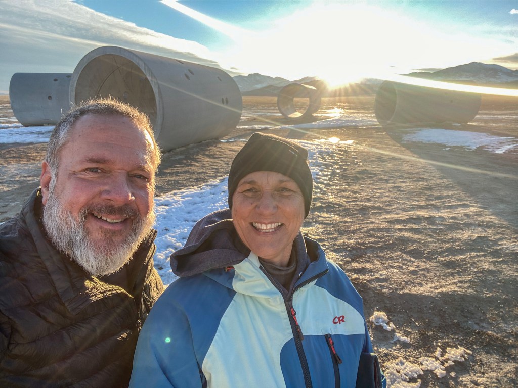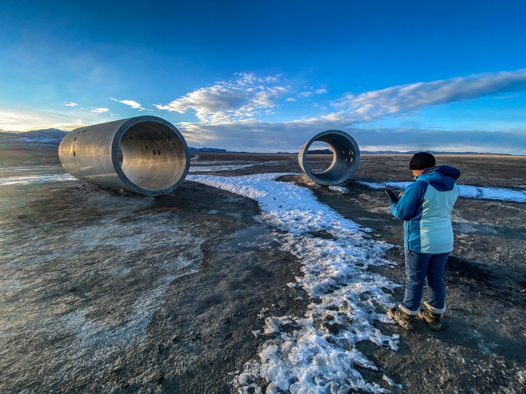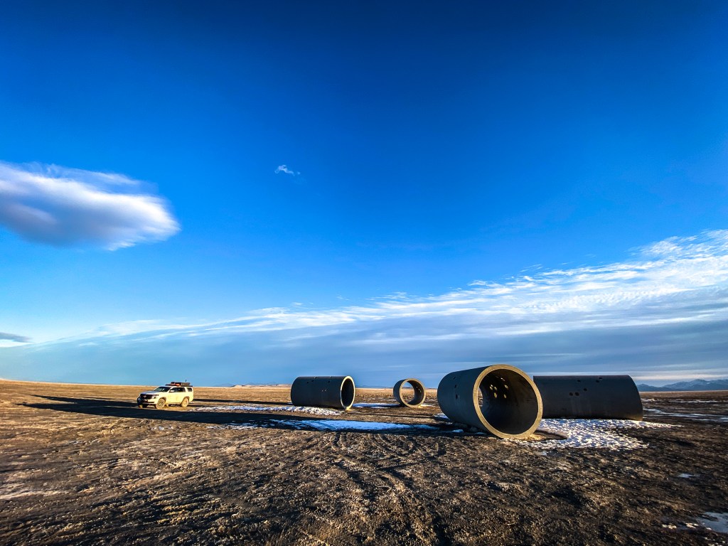 On Christmas Day, Mindy, the girls, and I made the three-hundred mile trek in the WRōV out to one of several unusual art installations around the Great Salt Lake, the Sun Tunnels. Our route took us on I-80 west to the Bonneville Salt Flats, then a forty-five mile off-road overland to the edge of the Great Basin Desert where these four, twenty-two ton concrete pipes are situated in a cross-pattern to capture the sun through a pair at both its solstices.
